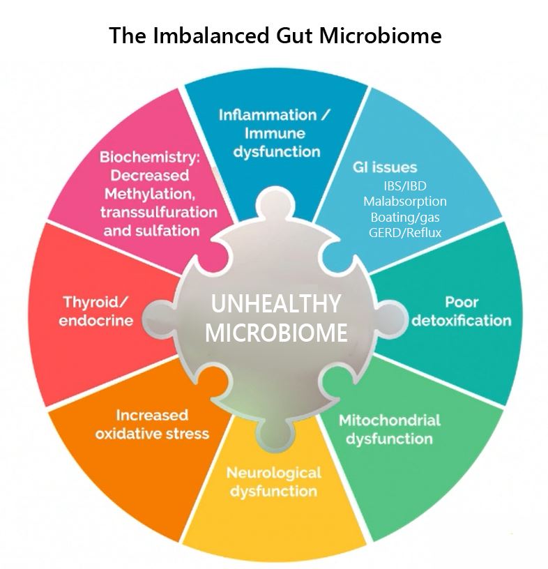 Check out the wheel of chronic ailments that stem from an imbalanced gut microbiome! Do you have chronic inflammation? Nasal infections? Gastrointestinal Tract Issues? Thyroid problems? Depression? Exhaustion?